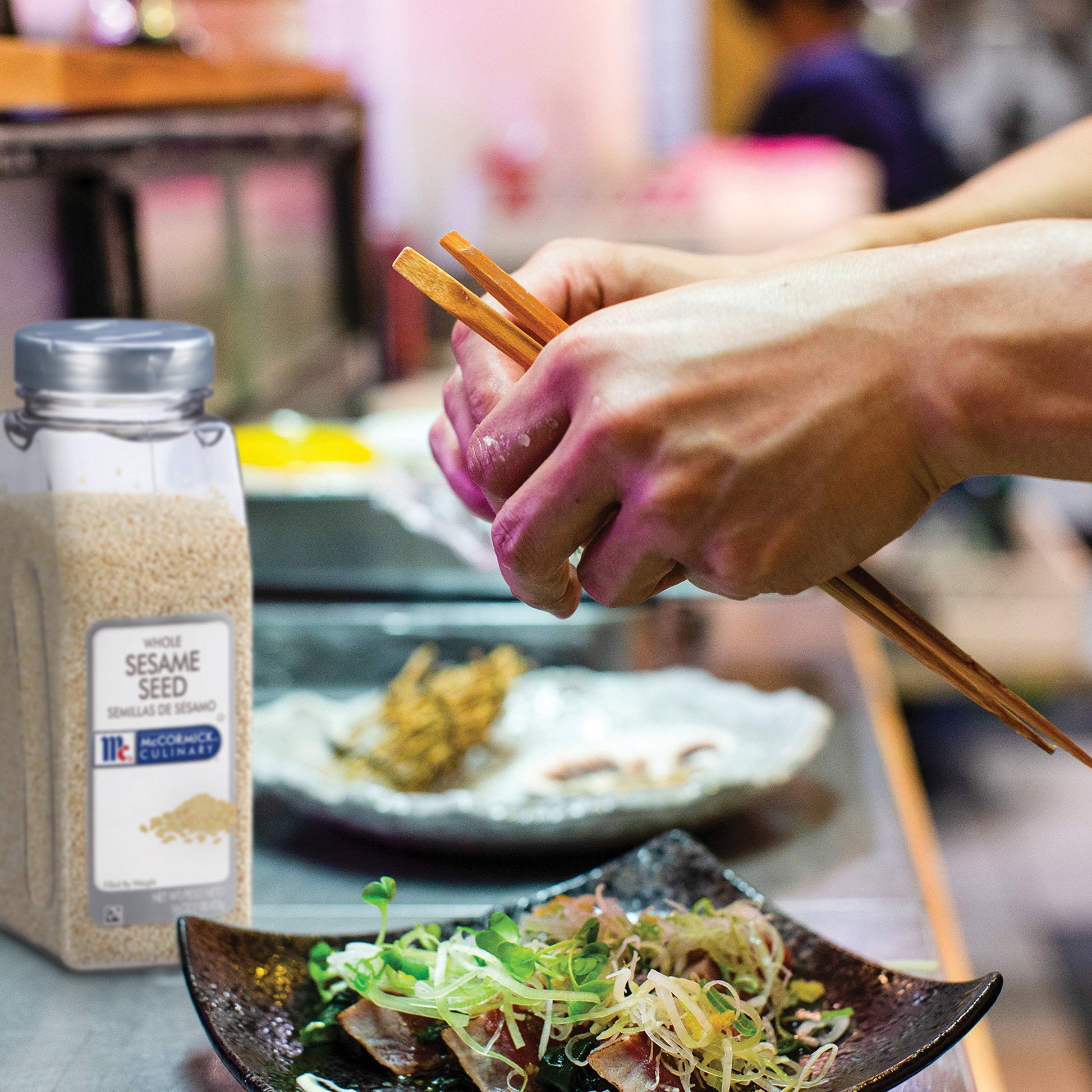 Details: McCormick Culinary White Sesame Seeds add a crunchy texture and a mildly nutty taste to all your favorite recipes. Do you want to intensify the flavor of your dish? Try toasting whole sesame seeds and sprinkling over sushi, Asian stir-fries, or coatings for fish, meat or noodle dishes. Add them to rice, chicken, salads and even desserts. For a contrasting, bold garnish, mix them with black sesame seeds. If you want to dress up your best recipes with stunning presentation elements, sesame seeds can help. White sesame seeds complement light dishes and provide striking contrast against dark foods. Whether you want to garnish a loaf of bread or add depth to noodle dishes with rich sauces, sesame seeds have the versatility for the job. Although sesame seeds taste great raw, toasting them enhances their crunchy texture and nutty flavor. Mouthwatering recipes that use sesame seeds include tahini, dukkah, Asian salmon, chicken yakitori and Chinese chicken salad. If you want to try one of these dishes, you'll appreciate how easy it is to toast whole sesame seeds. Toast your sesame seeds in the oven for the best results, and start by preheating your oven to 350 degrees. Use foil or parchment paper to line a rimmed baking sheet for easy cleanup. Arrange your seeds on a prepared baking sheet in a single layer. Toast then until they're fragrant and golden brown while occasionally stirring for about eight to 10 minutes. Next, remove your tray from the oven and immediately move the seeds to a plate to cool. Store seeds in a freezer storage bag in the freezer for up to one year. You can also store seeds in an airtight container in the pantry for six months. Whole sesame seeds from McCormick come in large 16-ounce containers, perfect for professional use. The lid includes both spoon and shaker dispensing options, and the bottle's sides are flat for added convenience.